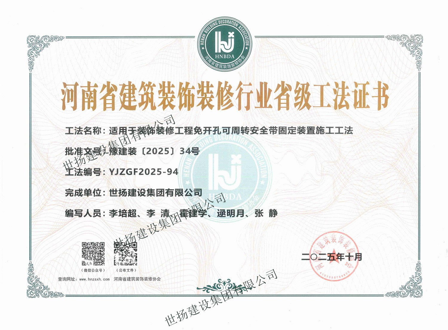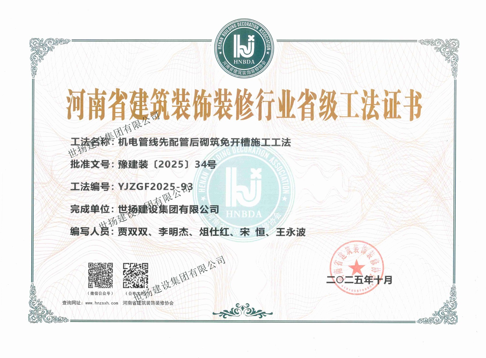 2025河南省建筑裝飾裝修行業(yè)省級工法證書