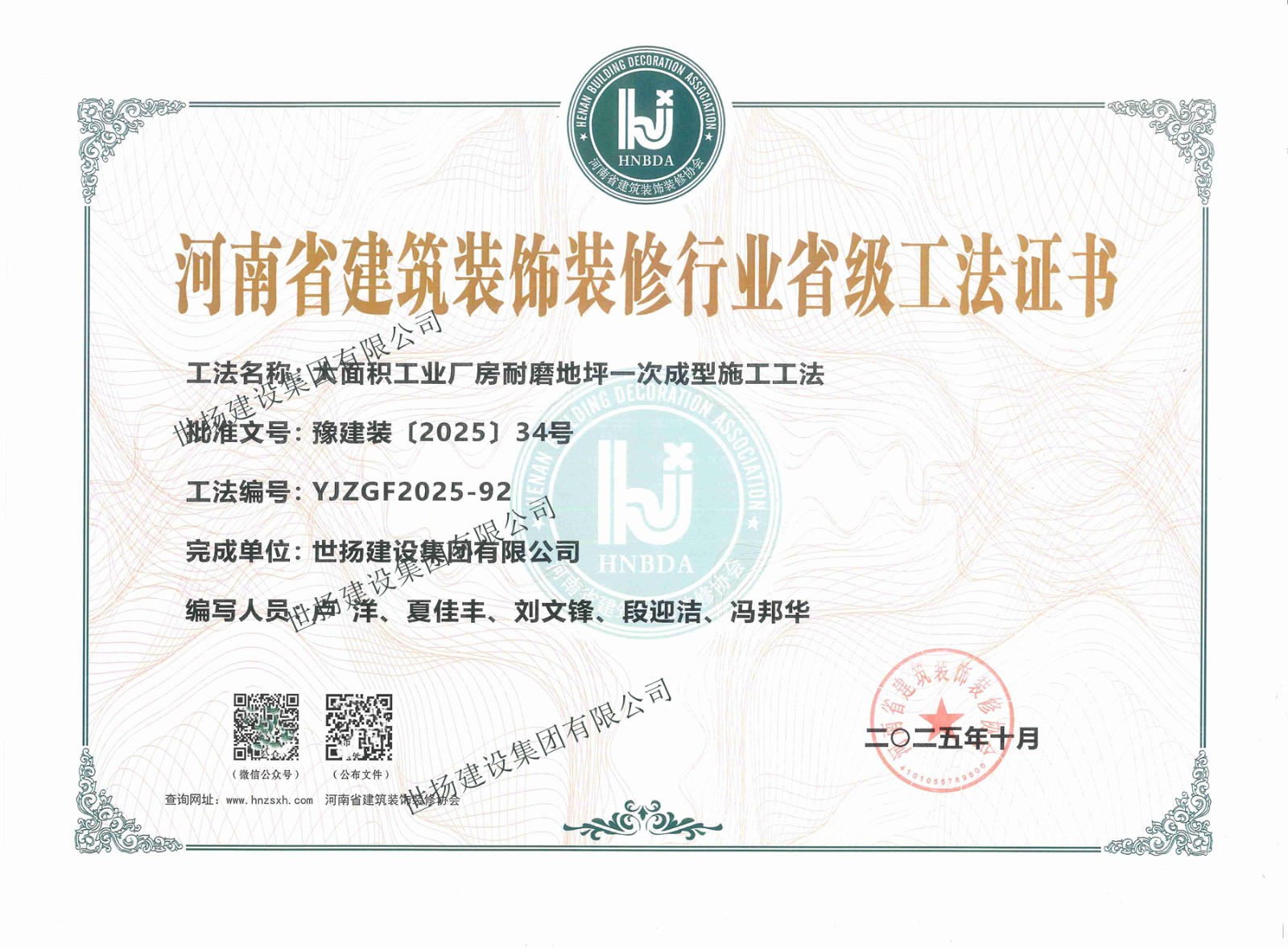 2025河南省建筑裝飾裝修行業(yè)省級工法證書